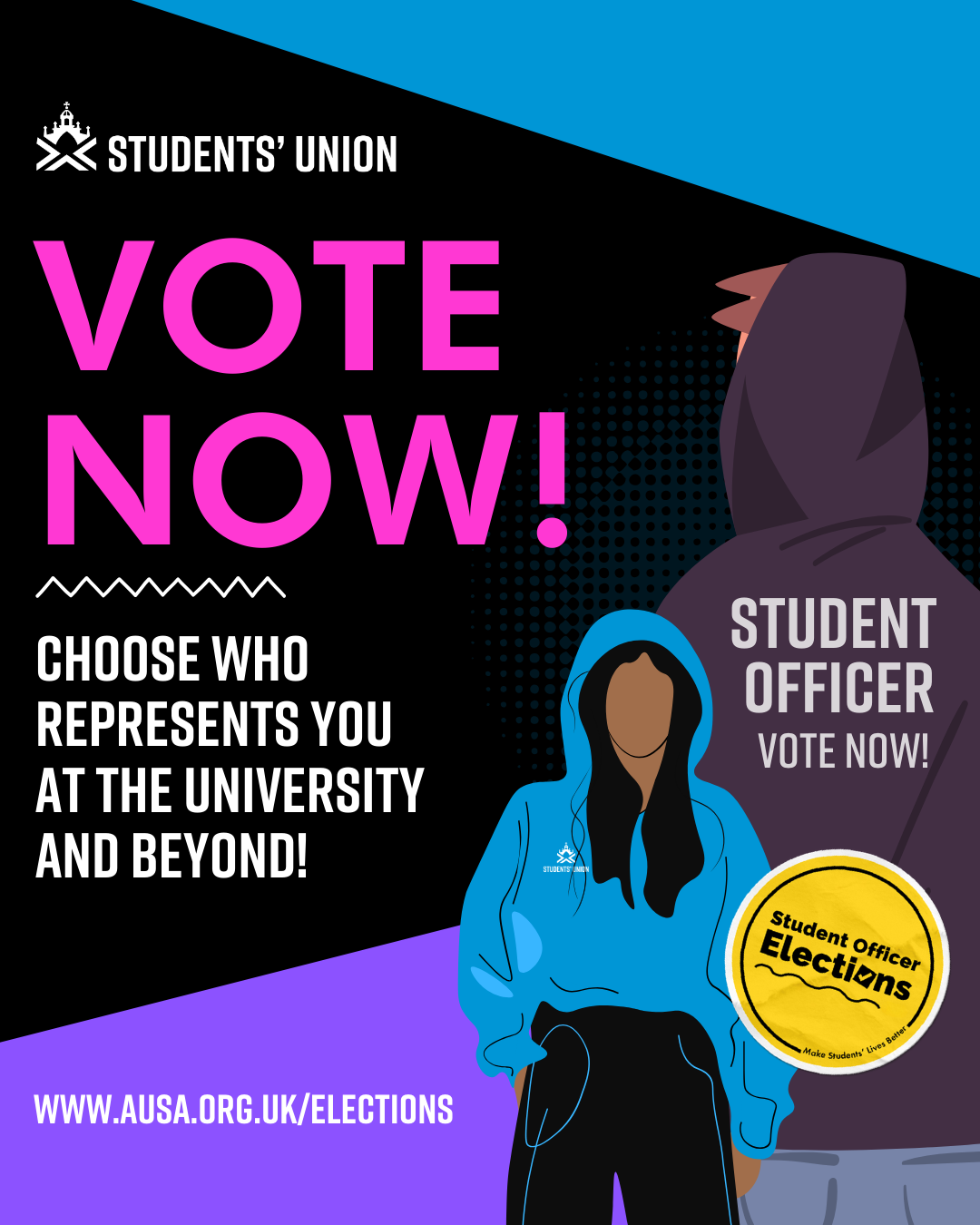 Voting is now open in our 2026 Student Officer Elections. This is your chance to choose your full-time paid student representatives for 2026/27 and help make students' lives better.2> Click Here to vote now!